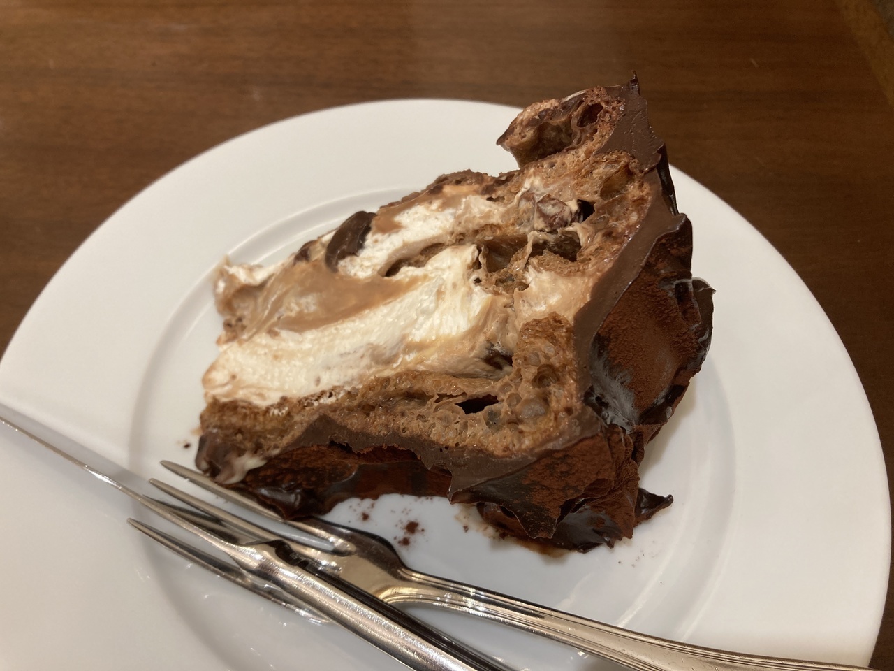 写真は、週末に行ったHARBSのチョコレートカスタードケーキ。ココアのシュー皮の食感もよく、洋酒がきいていて、美味しくいただきました!